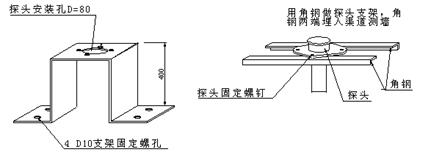 传感器要安在支架上。根据现场所使用的量水槽的构造条件自行加工。支架可以做成“门”字形,安装时跨装在渠道上。注意留出安装探头的孔。如果渠道侧墙允许,也可以用两根角钢如图做成探头支架。
