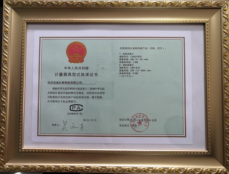 迪泰尔智能涡轮流量计已申请计量器具型式评价批准证书;编号:CPA:2018F079-32