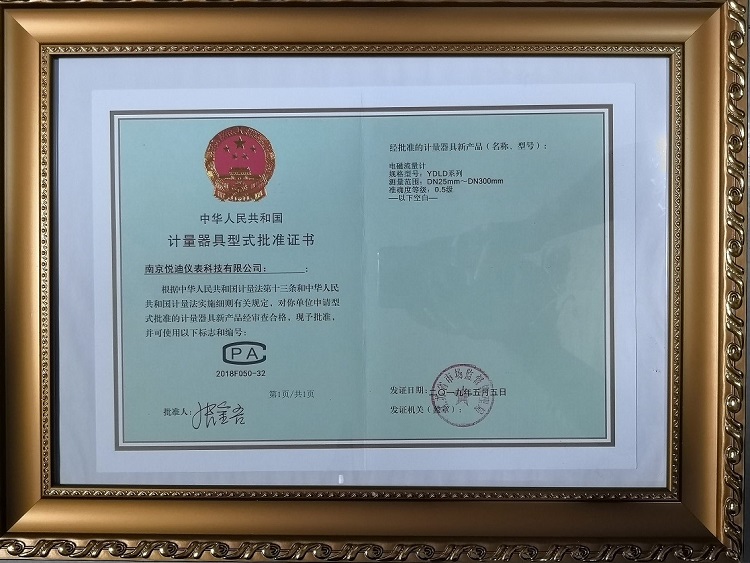 迪泰尔智能电磁流量计已申请计量器具型式批准,编号:CPA:2018F050-49;